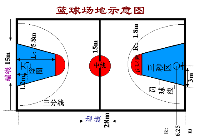 3.該圓弧的圓心要在對方球籃的中心垂直線與地面的交點(diǎn)上。圓心距端線內(nèi)沿中點(diǎn)的距離為1.575米。 注:假如球場寬度少于15米,圓弧仍按上述6.25米半徑畫出。