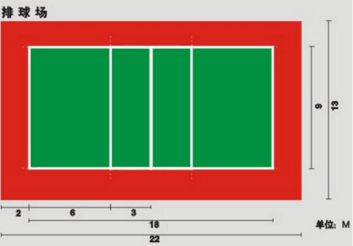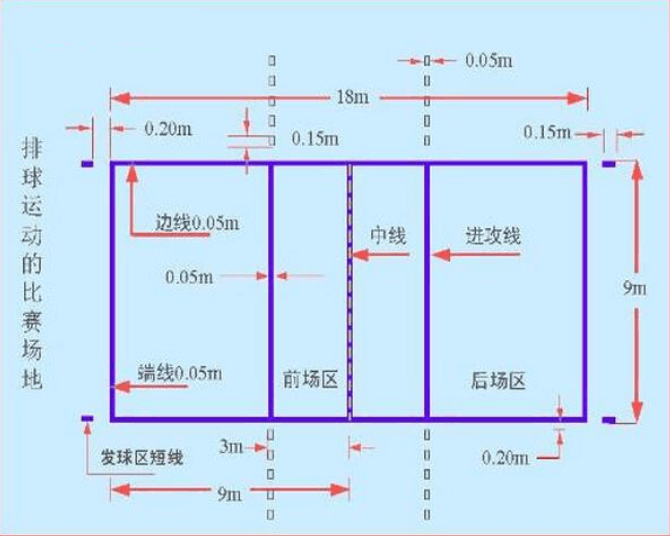 二、面積:比賽場區為18米×9米的長方形。其四周至少有3米寬的無障礙區。比賽場區上空有無障礙空間從地面量起至少高7米,其間不得有任何障礙物。行業排聯世界性比賽場地邊線外的無障礙區至少寬5米,端線外至少寬8米,比賽場地上空的無障礙空間至少12.5米高。成年世界錦標賽和奧運會比賽,基無障礙區邊線外至少寬6米,端線外至少寬9米。