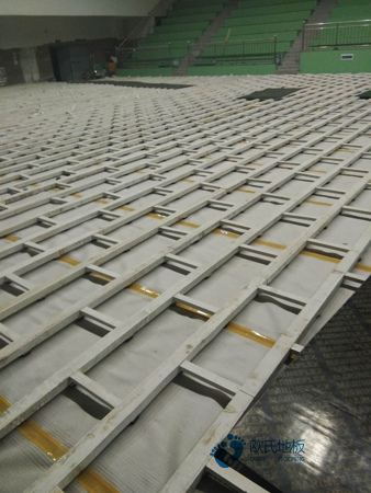 二、場地清掃:籃球館木地板安裝進場前首先檢查地面有沒有做防水,尤其是一層地面,然后對場地進行清掃,鏟除水泥砂漿虛浮物備用。