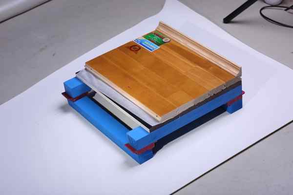 各結構試件將有破損和力學性能指標有所下降的現象,為保證實驗數據的準確性,在進行本節實驗過程中,重新更換了結構層材料,并對結構規格進行再放大調整,但各結構層材料參數不變。歐氏運動木地板工程師,指面層材料為實木集成地板,毛地板層為落葉松膠合板,龍骨層為雙層結構,且材料為LVL結構的體育木地板;指面層材料為多層膠合板復合地板,毛地板層為落葉松膠合板,龍骨層為雙層結構,且材料為LVL結構的體育木地板;指面層材料和毛地板層材料與實木雙層相同,龍骨層為單層結構,材料為LVL結構的體育木地板;指面層材料為實木集成地板,毛地板層為落葉松膠合板,無龍骨層結構的體育木地板。單層結構和無龍骨結構的沖擊吸收性能值均較雙層結構的沖擊吸收性能低。