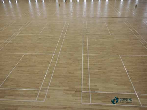 可起到部分調節室內溫度和濕度的作用。腳感舒適:羽毛球館木地板具有適當的彈性,防滑摩擦系數標準,管用避免運動損傷。環保性好:羽毛球館木地板采用甲醛釋放量較低的膠粘劑,通過先進制造工藝層壓而成,環保性能較好,符合1環保強制性標準要求。結構穩定:羽毛球館木地板特殊的結構特點,即各層板材纖維的縱橫交錯,既抵消了木材的內應力,也改變了木材單向同性的特性,基本上克服了容易、開裂和變形等缺陷,保證具有較好的尺寸穩定性。經久耐用:羽毛球館木地板采用較好的亞光漆和亮光漆,色澤柔和又耐磨性強,無需打蠟維護,具有良好的防潮、防腐、隔熱、隔音、保溫、抗菌、防蟲、絕緣、不助燃和耐氣候變化能力強等性能,可營造舒適的運動環境。